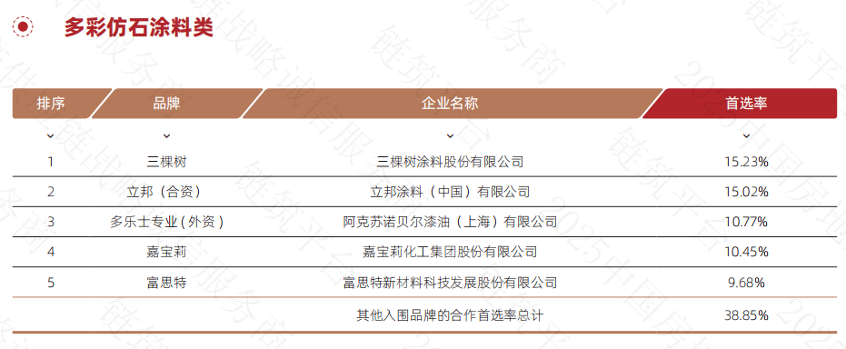 在多彩仿石涂料类榜单中,嘉宝莉同样位居第四,首选率为10◁▼▽.45%●○◆,与行业头部品牌共同引领仿石质感装饰市场。