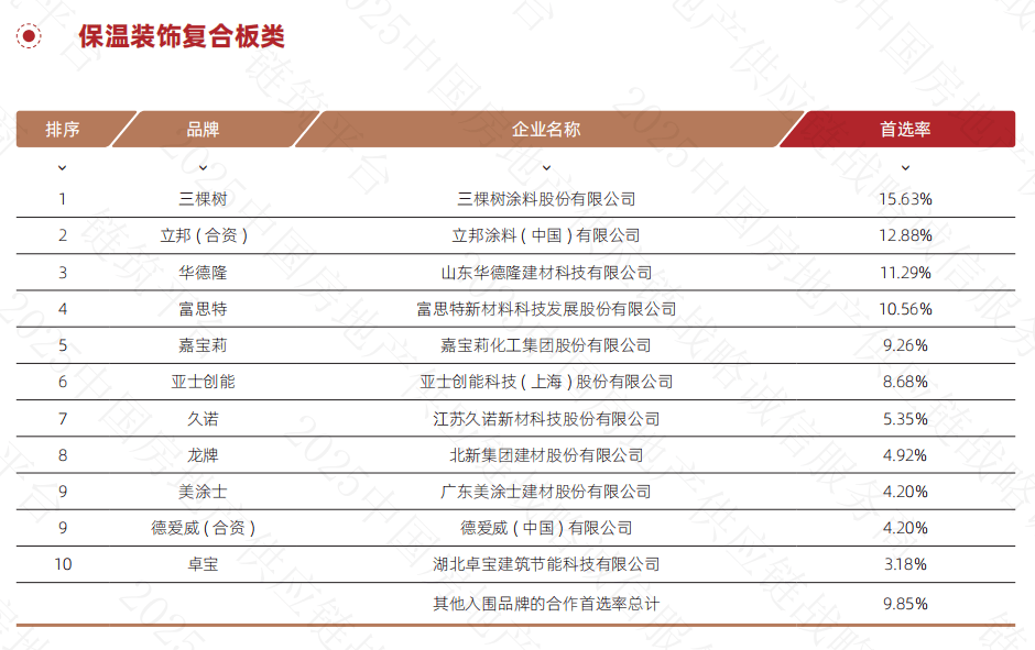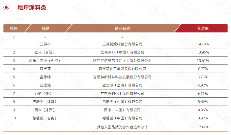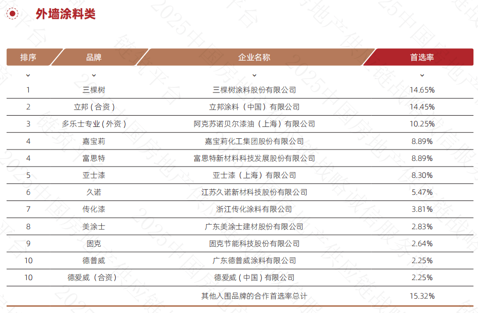 报告显示=△•,嘉宝莉在外墙涂料类榜单中位列第四=○△,品牌首选率达8.89%◆-=,仅次于三棵树、立邦和多乐士专业,在国内涂料品牌中名列前茅。