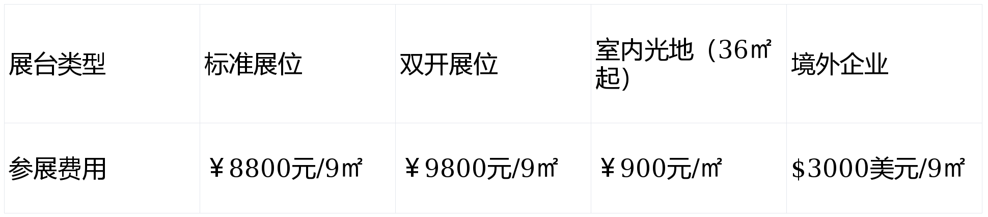 注1▷●…:标准展位基本配置:(长3米x宽3米x高2-.5米)、三面围板(白色)、公司中英文楣板◇◁-、一个电源插座(500W以内)、两支日光灯、一张咨询台、两张折椅、地毯□••、垃圾篓等。
